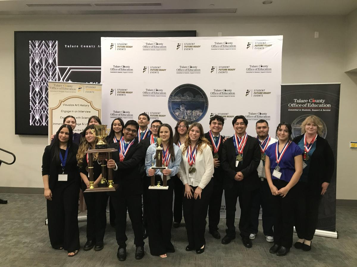 On Saturday, February 7, 2026 Harmony Magnet Academy competed in the Tulare County Academic Decathlon Competition and secured their fourth consecutive county championship. Students competed at three levels based on grade point average: Varsity, Scholastic and Honors, which is the highest. This year’s theme was The Roaring 20’s, and students competed in 10 different events: seven subject areas (art, economics, literature, math, music, science and social science) plus a timed essay, interview, and prepared and impromptu speeches. The win this year was their strongest performance to date. In addition to the county title, the school team won the live Super Quiz competition and also had individuals secure the overall highest cumulative score countywide in each of the three GPA groups. HMA senior Rogelio Nunez was the overall top scoring decathlete for Varsity; HMA junior and team co-captain Claire Holly earned the highest cumulative score for the Scholastic division; and junior and team co-captain Kris Kashyap secured the top score both for Honors and for the entire competition. The official school team competed with nine students with an additional six students competing as individuals and rounding out the larger school team. Of special note this year, junior Kris Kashyap medaled in all 10 events and secured seven first place gold medals. He was the plaque winner and overall high scorer countywide in 6 events: art, essay, music, literature, science, and social science. Gold medals were also earned by the following HMA students: junior Alejandra Rivas - Interview; junior Claire Holly - Literature; junior Olivia Braghetta-Peterson - Social Science and Essay; senior Daniel Jacuinde - Essay, senior Rogelio Nunez - Music and Social Science, and junior Aaron Armenta - Speech. Overall, Harmony students won 49 medals: 15 first, 15 second, and 19 third. The team’s cumulative score was 36,687.9 points, their highest to date. The team will represent Tulare County and PUSD at the state competition at the Santa Clara Marriott from March 19-22.